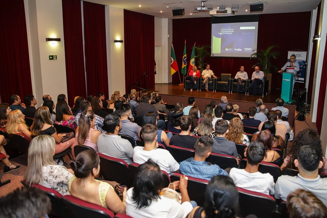 Os 83 alunos do Programa Qualifica Canoas receberam seu diploma, em uma cerimônia que marcou a finalização das atividades de quatro turmas de montador de equipamentos eletrônicos. O evento aconteceu na quinta-feira, 5, e reuniu alunos, professores, familiares dos formandos, lideranças municipais e representantes das três empresas já instaladas no Parque Canoas de Inovação (PCI): Exatron, Novus e TCS.