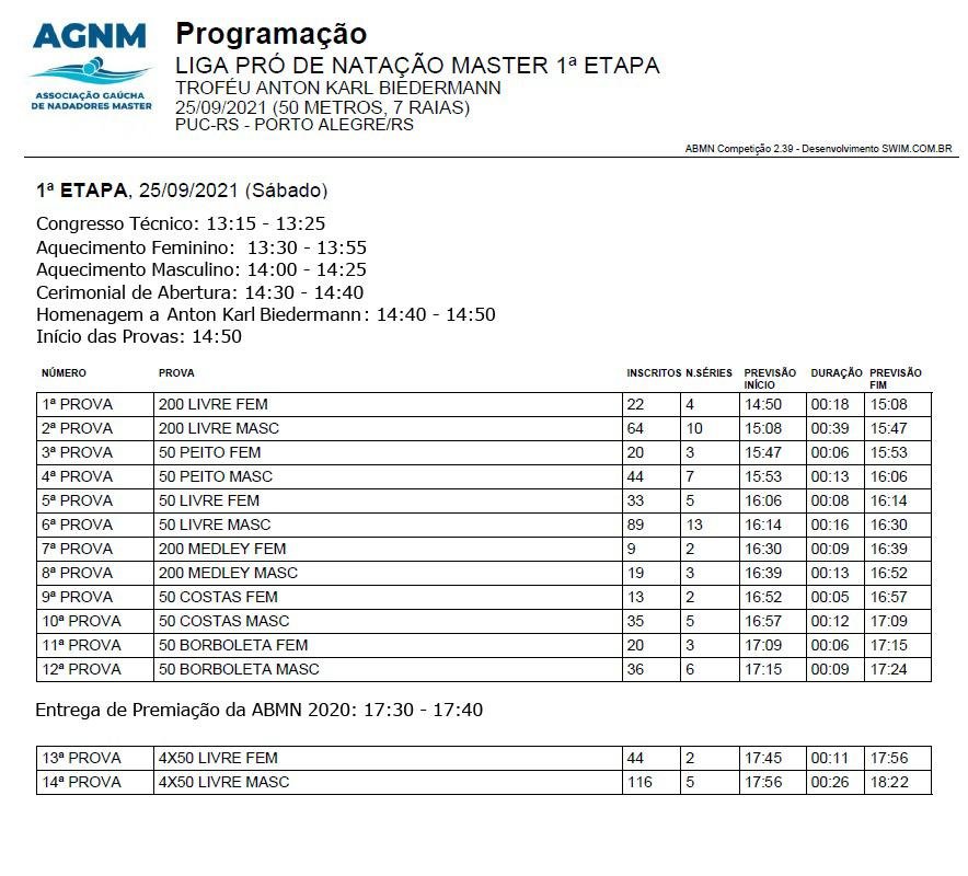 A Associação Gaúcha de Nadadores Masters – AGNM – promove neste sábado, dia 25, homenageando o atleta master Anton Karl Biedermann, na piscina de 50 metros da PUC-RS, em Porto Alegre, a 1ª etapa da Liga Pro de Natação Master. Este é o primeiro evento da Associação após reestruturação no início de 2021 e também a primeira competição do ano da categoria master no estado.