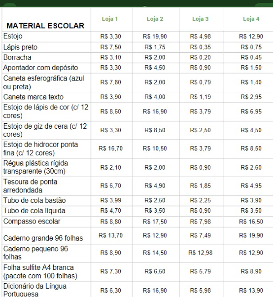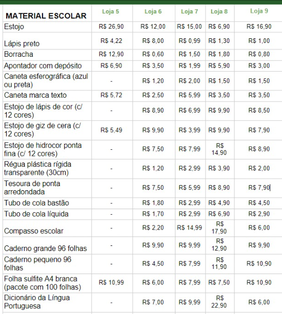 Promovida pelo órgão municipal em nove pontos comerciais (oito papelarias e um hipermercado), a pesquisa contemplou 18 itens e ocorreu entre os dias 17 e 24 de janeiro.