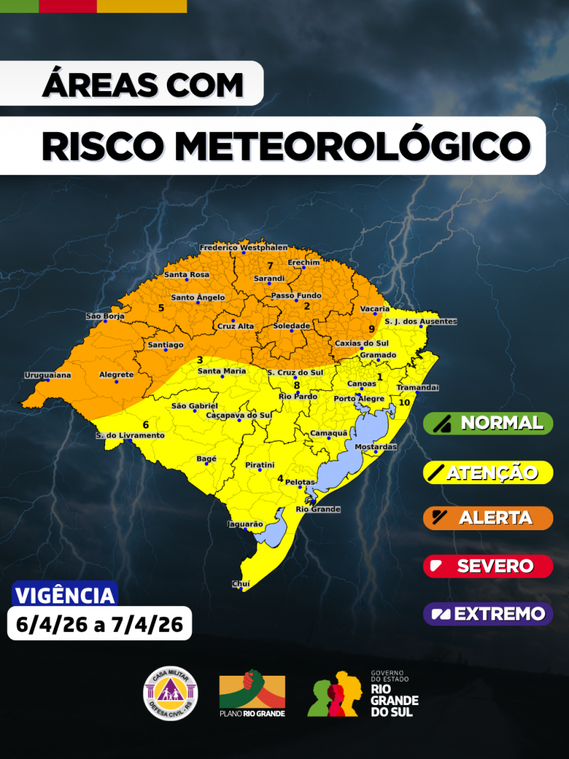 Na terça-feira, 7, o cenário de instabilidade persiste em grande parte do Estado. As tempestades devem ocorrer desde a madrugada nas regiões das Missões e Centro, avançando ao longo do dia para outras áreas, como Região Metropolitana, Vales, Noroeste, Norte, Serra e Litoral Norte.