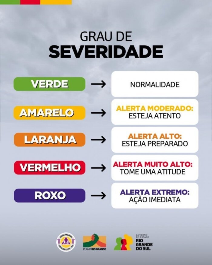 Os novos alertas serão divulgados nas seguintes cores, representando sua gravidade: